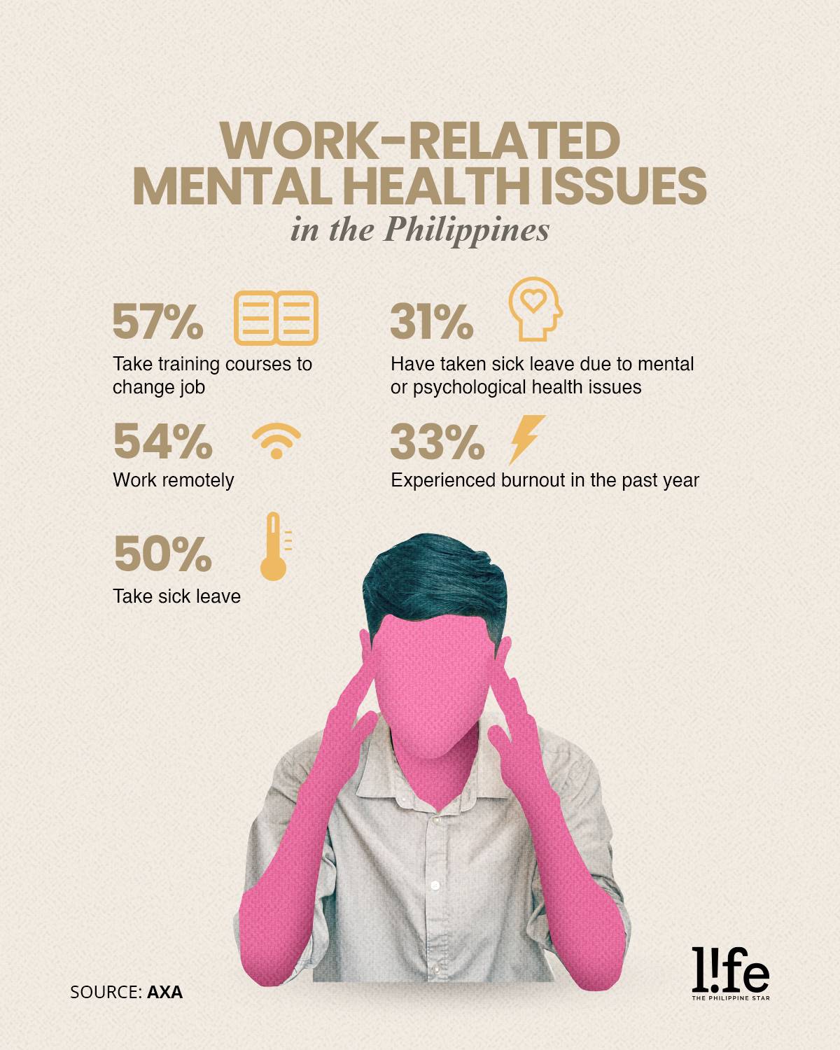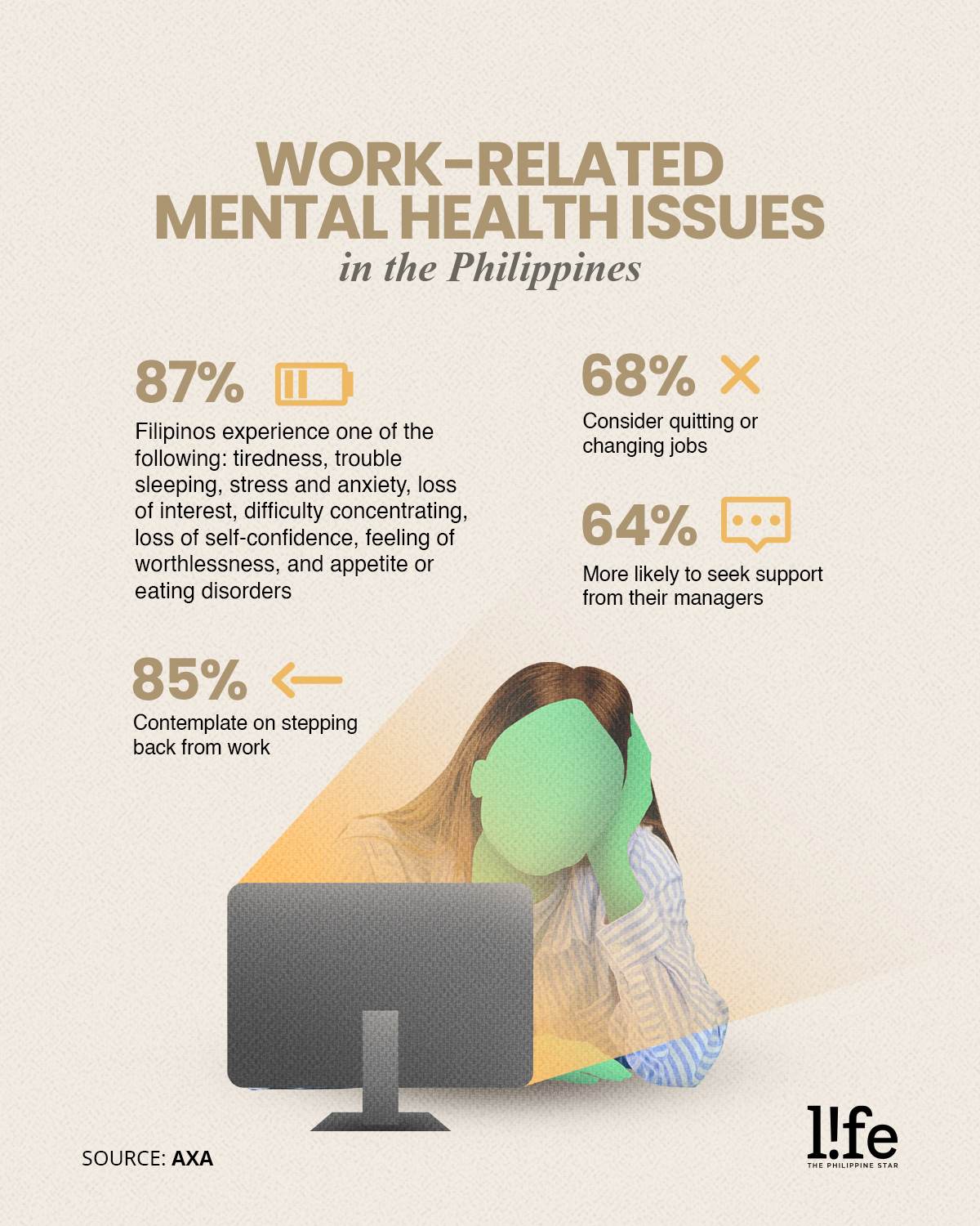 According to the findings of the Mind Health Study conducted by insurance provider AXA, 87% of Filipinos were revealed to be experiencing at least one mental health issue caused by their work environment. This number is 11% higher than the global average.