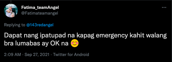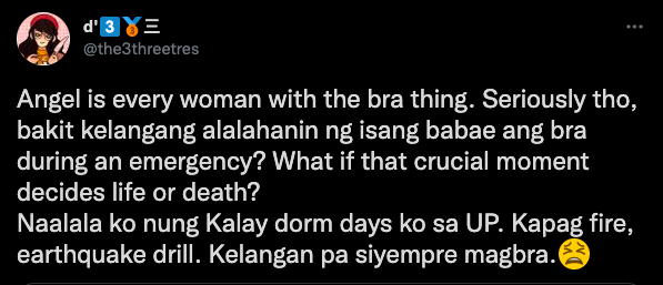 While most women shared how they related to her tweets and even picked up an idea to include a bra in their go bags, some of them took the chance to point out that the sight of braless women during emergencies should not be a big deal anymore.