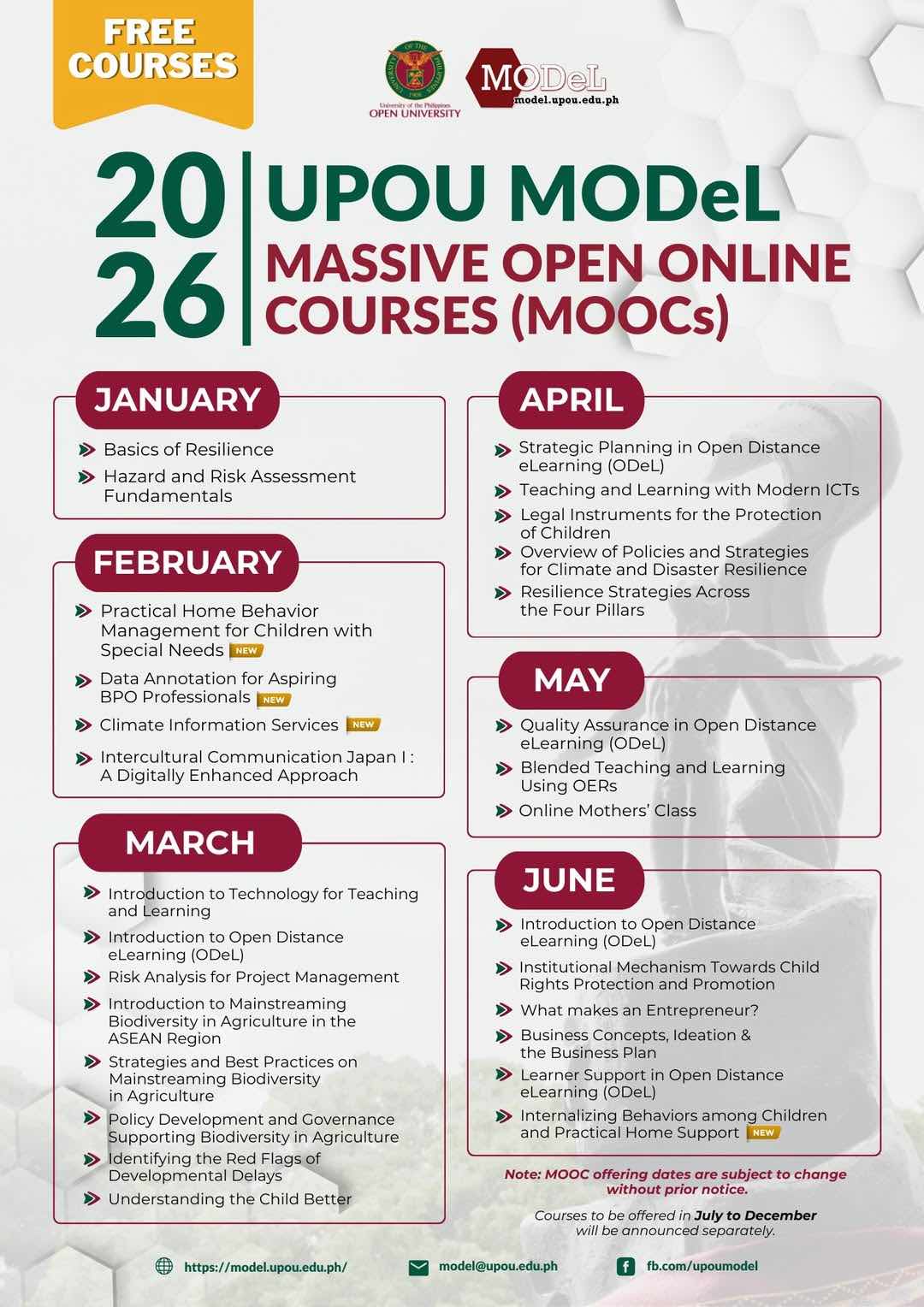 The UPOU released 28 massive open online courses (MOOCs) on Facebook, with four brand new ones, such as Practical Home Behavior Management for Children with Special Needs, Data Annotation for Aspiring BPO Professionals, Climate Information Services, and Internalizing Behaviors among Children and Practical Home Support.