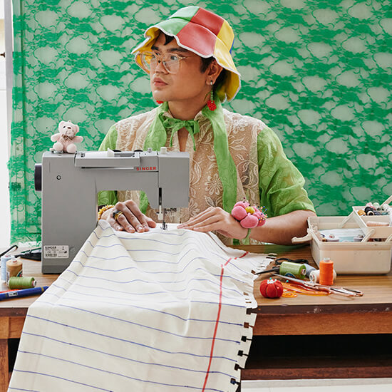 What keeps him anchored is his love for self-expression. “What I’m doing will always be a love letter to that dreamy-eyed kid, catwalking in his draped blanket gown. I continue to create because I want to relive the childhood filled with uninhibited pure queer joy I experienced as I played with my dolls and dressed up in household items.”