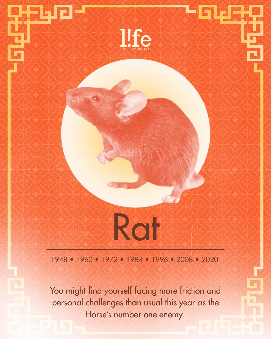Since Rat is considered the number one enemy of the Horse in the Chinese zodiac, you may be prone to conflicts and problems this year. Don't be overly trusting of other people and easily swayed by what they say. Make sure to keep your physical and mental health in check, and avoid hazardous activities especially when traveling. Say hello to anything that could help you attract more positive energy into your life.