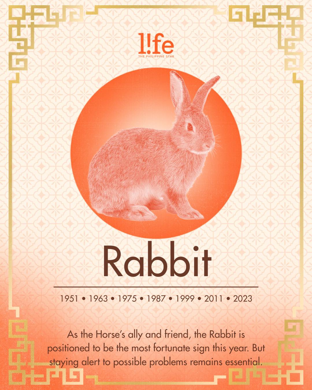 Rabbit is expected to be the luckiest sign of the year as the Horse's good friend and ally. However, you should still be wary of potential conflicts and stay cautious of people who may have bad intentions toward you. Avoid overworking and stay particularly careful of water-related accidents, including simple hazards like wet floors that could lead to falls. To make the most of your luck this 2026, practice a balanced lifestyle for your physical and emotional well-being.