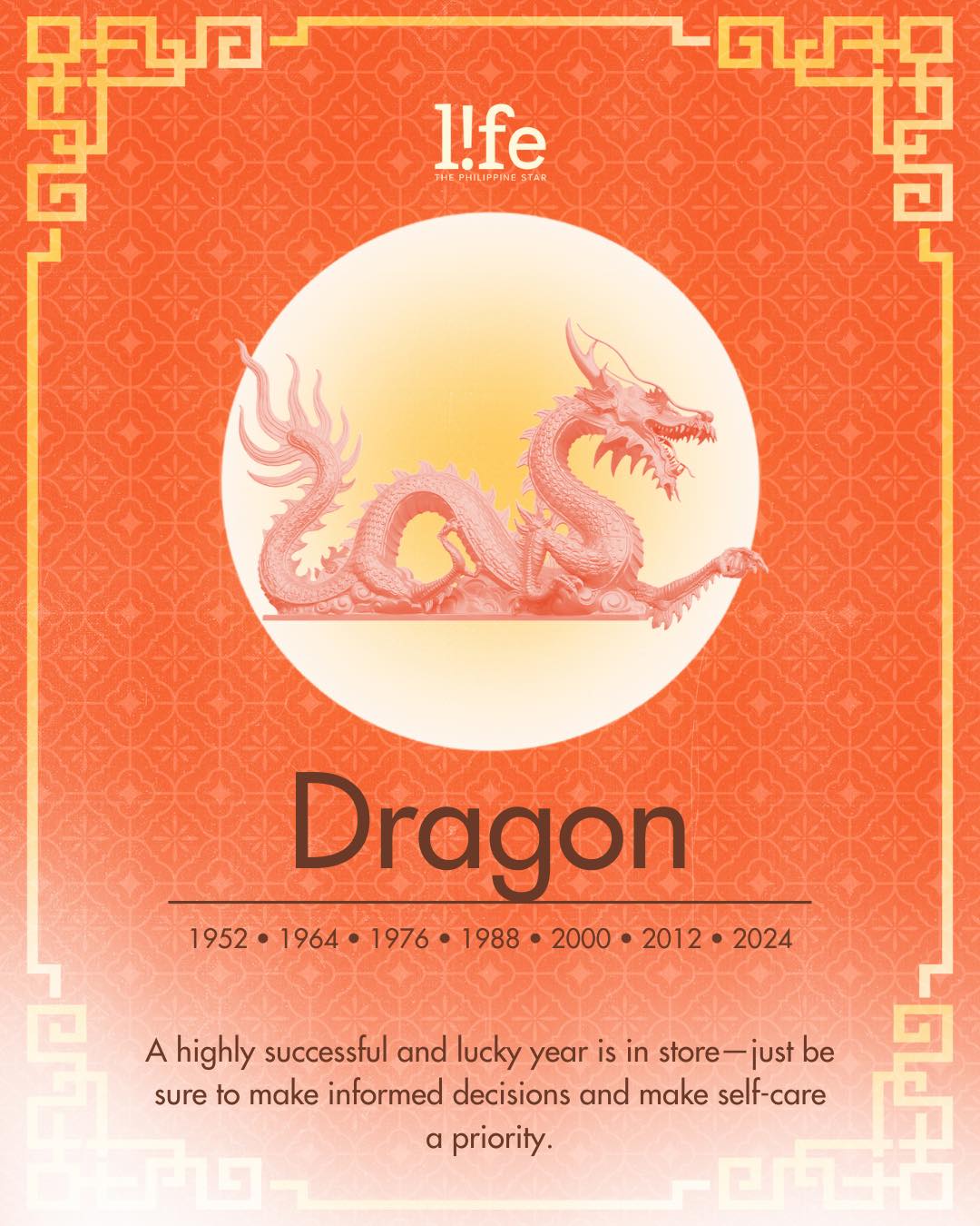 Expect a good year ahead with high luck and success, Dragon. But remember that it's important to avoid making decisions when emotions are high. Manage stress by having some me-time when you can. Look after the well-being of your family, too, as the entire household may be prone to viral infections or similar issues. Remain extra cautious of accidents throughout the year.