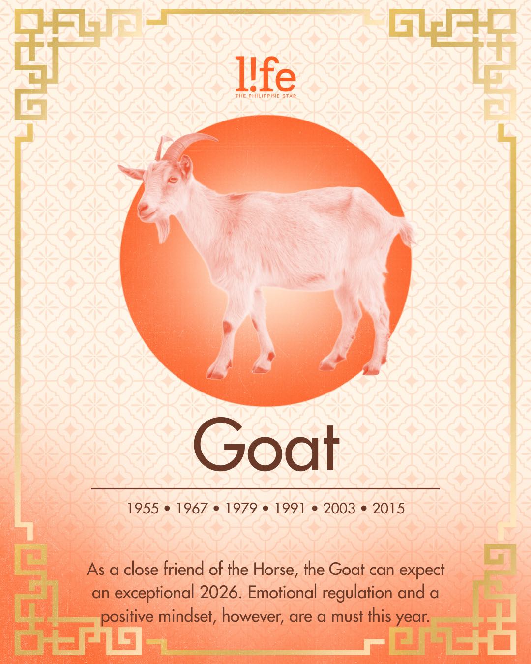 Since the Goat is also the Horse's good friend, 2026 should be an incredible year for you. Make it a point to manage your emotions and avoid anxiety or overthinking while maintaining a positive mindset for your healing. It's likewise important to be cautious of accidents and avoid dangerous situations.