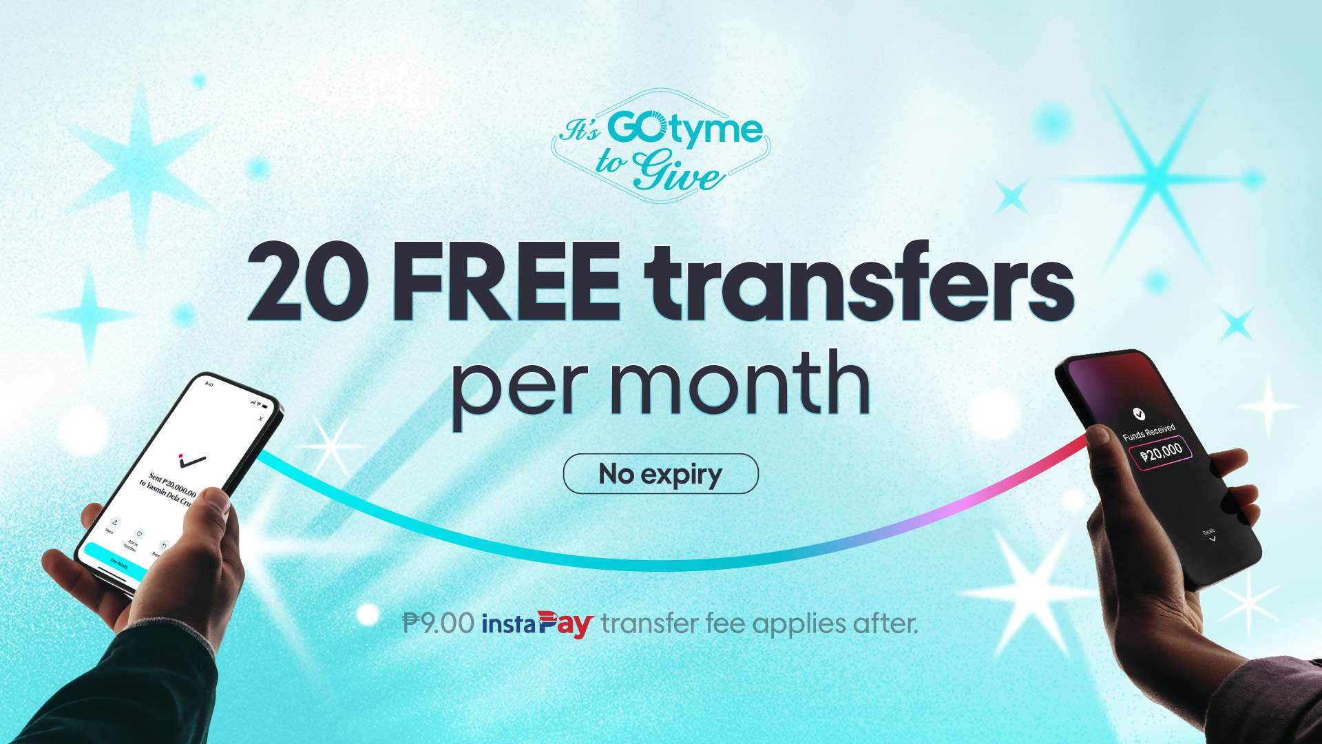 Switch to GoTyme Bank and enjoy 20 free InstaPay transfers every month. Open your account and get your free debit card in just 5 minutes at any GoTyme Bank kiosk nationwide and start sending love without fees.