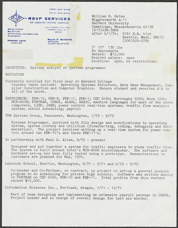 What also caught most people's attention with the resume is the personal data. Gates said he was 5'10" and weighed just 130 lbs, had no restrictions with locations, and had a salary of $12,000.