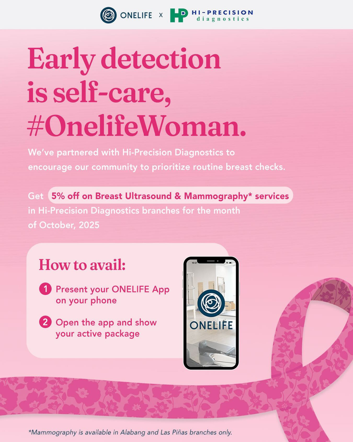 Wellness brand Onelife Studio has partnered with brands to launch special deals this October. You can enjoy 5% discount on Breast Ultrasound available at Hi-Precision Diagnostics branches in Luzon and Mindanao, as well as 5% off on Mammography available in Alabang and Las Piñas branches.
