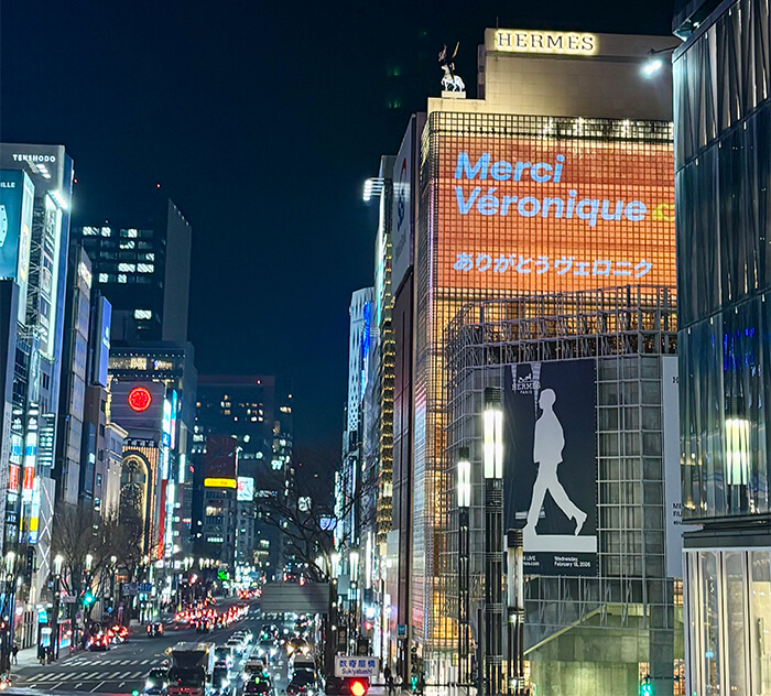 From the expressway venue, the luminous façade of Maison Hermès Ginza glimmered in the distance. On its electronic billboard: “Merci Véronique.”