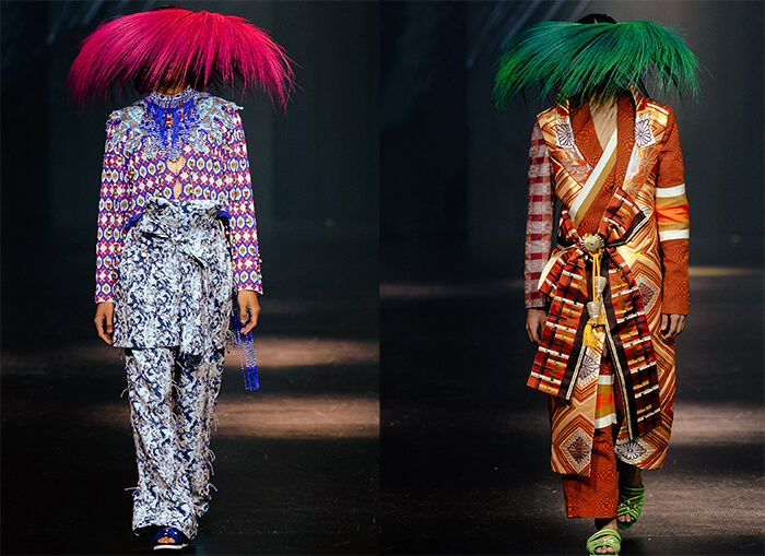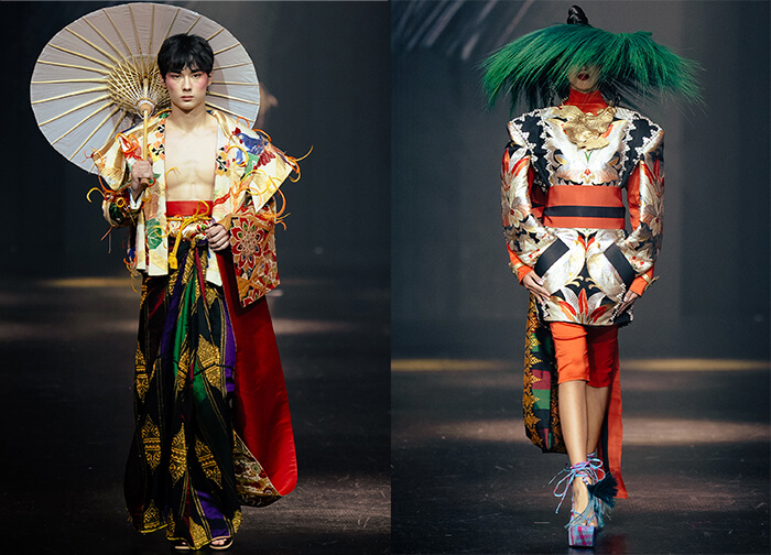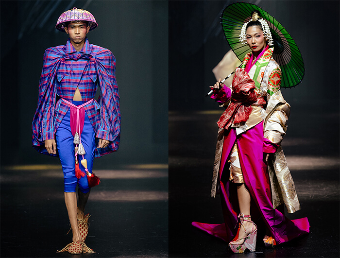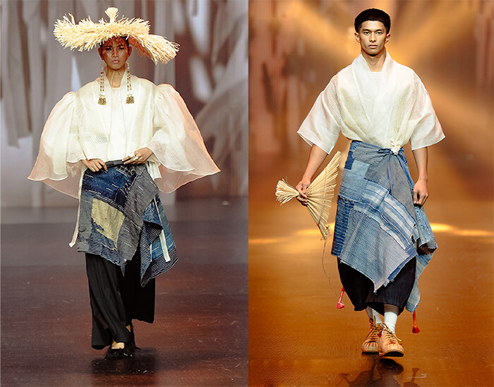 His merry mix of fabrics includes Japanese obi brocade, plaid silk taffeta, and indigenous weaves cut in sculptural shapes inspired by samurai armor as well as Gaddang tapit ceremonial capes from Cagayan Valley. These are paired with sarongs, skirts, and athleisure shorts, layered under fundoshi loincloths and accented by obi sashes that turn into trains.
