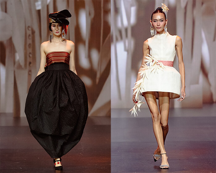 Identity and cultural relevance are hallmarks of Jaggy Glarino’s designs that feature crafts from his native Mindanao. For this show, he had to dig deep to find that there was a “Little Tokyo” in Mintal, Davao, in the early 20th century when Japanese immigrants settled to help build the abaca industry while establishing schools, businesses, and close-knit communities that became the largest of its kind in the country. He discovered the unique cultural exchange that transpired when he visited the IMIN (immigrant in Japanese) Museum, inspiring a collection that reflects heritage, migration, and memory.