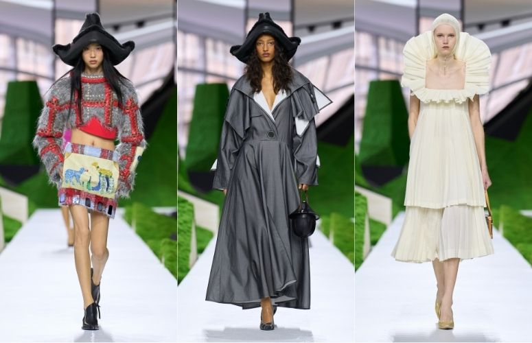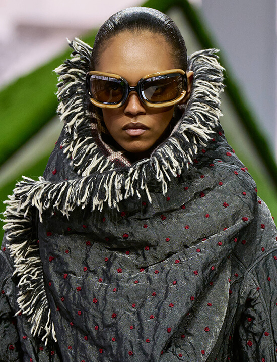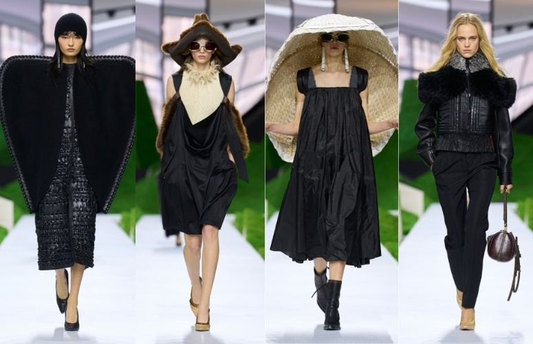 Silhouettes became protective, almost elemental. Outerwear swelled with volume, shoulders rising like small ridgelines. Dresses sometimes took on tent-like shapes, as if meant to shelter the body. You could sense the presence of climate—wind, rain, sun—written into the architecture of the clothes.