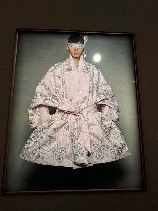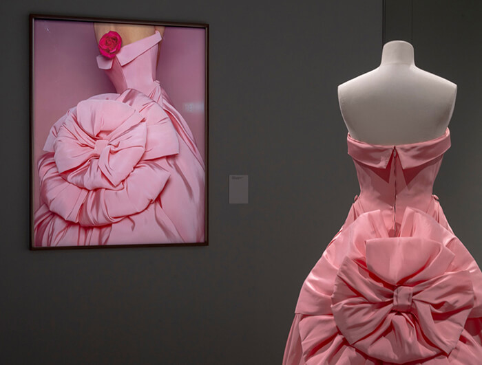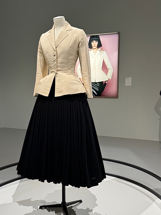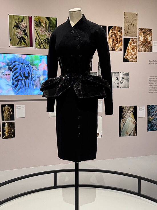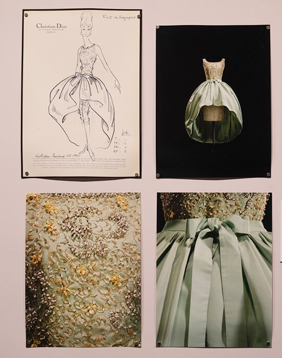 I was in awe of seeing original pieces such as the Bar Jacket, which revolutionized fashion in 1947 with its curvy shape. Apparently, it was called the Bar Jacket because it was intended for use after work when ladies would go bar hopping in the local square. It’s an interesting and fun anecdote. As an extension to this, there’s a display of a re-created Bar Jacket by John Galliano, which adapted its shape into a corset-like belt added to a black figure-hugging silhouette dress. Another amazing archival piece by Christian Dior was a pink Opéra Bouffe short evening dress in pink faille with a giant rose bustle.