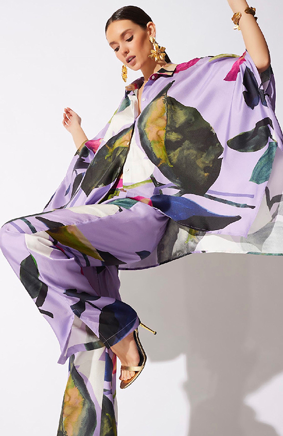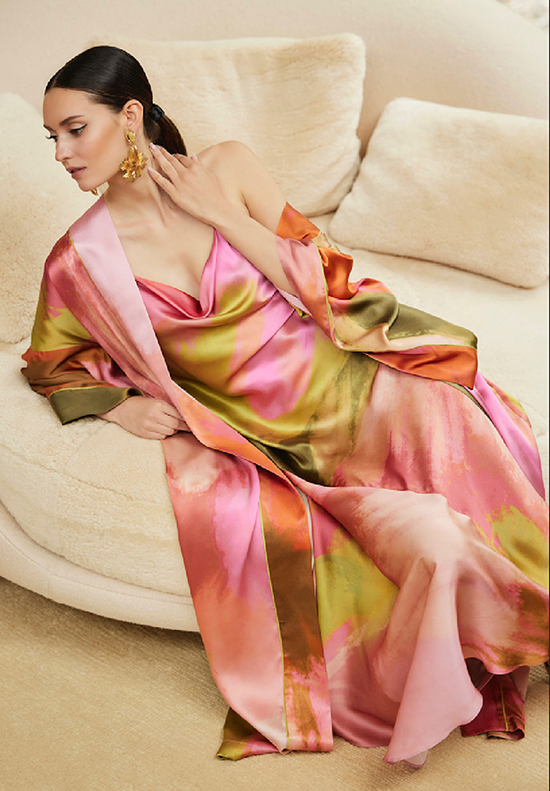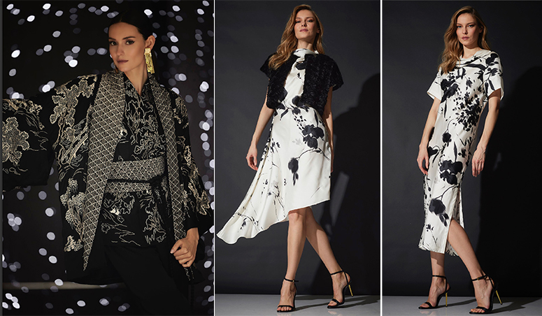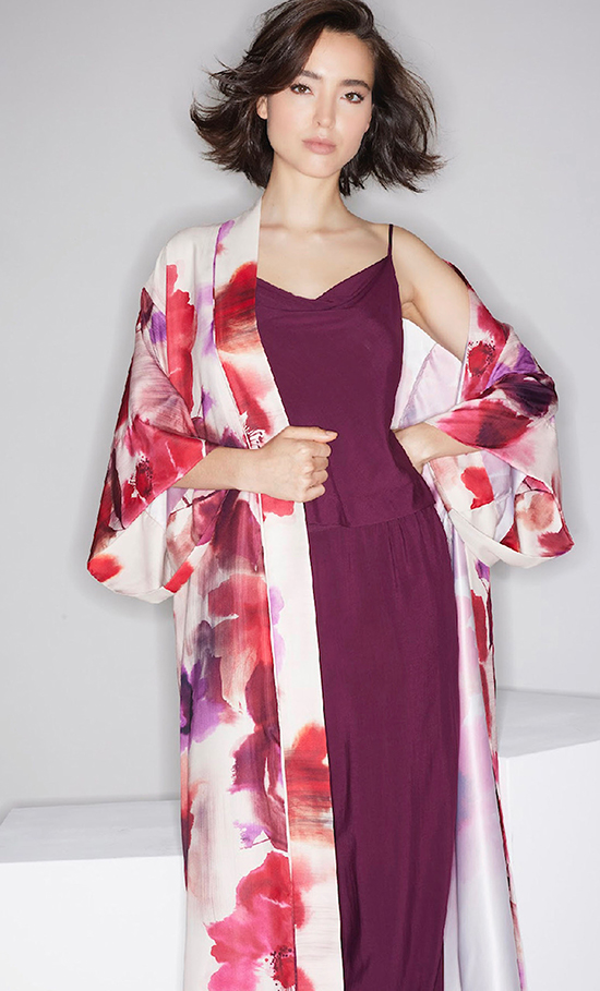 This season, Natori explores the layered aesthetic of Japanese tradition alongside the avant-garde revolution, all while embracing a distinctly modern sensibility. The Fall 2025 palette plays with earthy neutrals as a soft foundation, punctuated by expressive painterly florals and brushstrokes that inject movement and energy. Warm ruby shades harmonize with cool teal tones to create a contemporary feminine allure.
