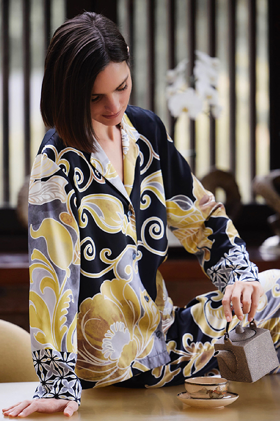 Innovative, seasonless fabrics—soft, flirty, fluid, or sculpturally structured—anchor the line, while Shibori-inspired Japanese taffeta enriches the textural range. Cultural details, 3-D embellishments, and shimmering sequins highlight the brand’s mastery of ornamentation. The collection beautifully balances effortlessness and sophistication, blending the structured drama of French couture with the pioneering spirit of Japanese design—an ode to Natori’s enduring vision of artistry and cultural fusion.