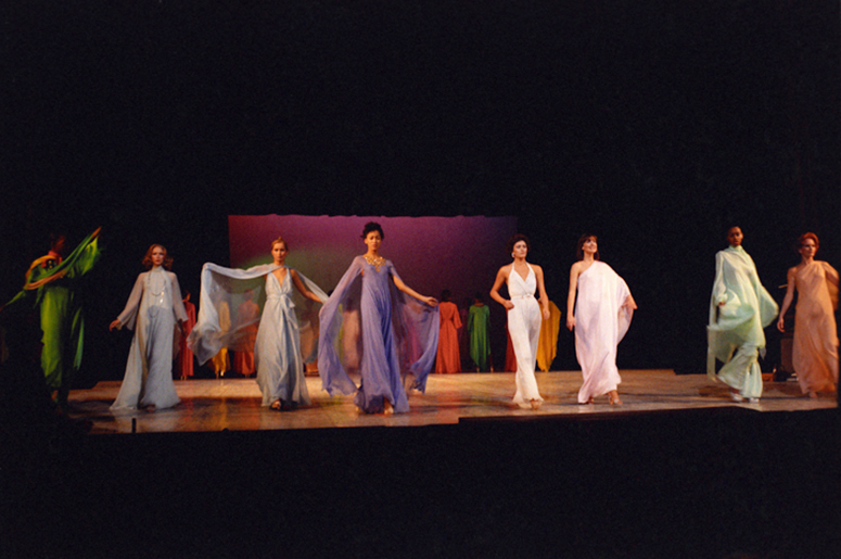His finale was a long-trained dress worn by Pat Cleveland, who came out spinning nonstop till she reached the edge of the stage with a perfect landing that had everyone sigh in relief. Then the rest of the models who were at the back all rushed en masse up front to join her. Upon reaching the edge, they froze and started posing — it was the precursor to Madonna’s “vogueing.”