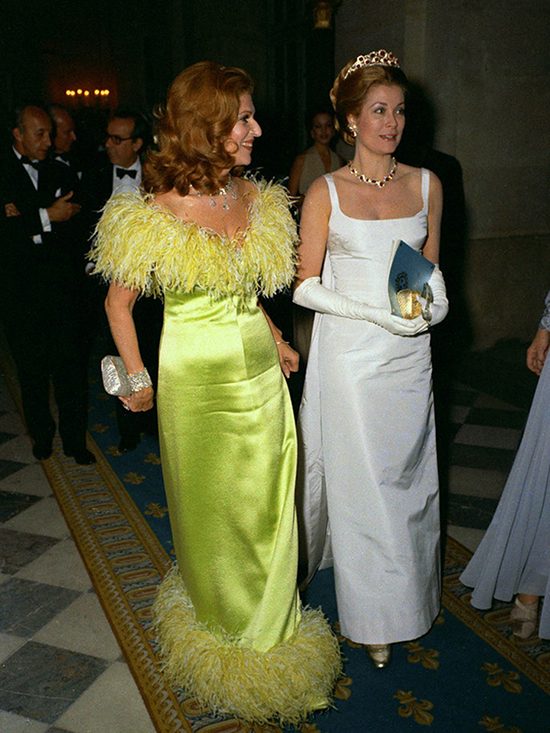The queen of the night was the evening’s host, Marie-Hélène de Rothschild, scintillating in a green ostrich-trimmed gown by Saint Laurent and solitary diamonds sparkling from her hair as she greeted the beau monde, from Grace Kelly, the Princess of Monaco, and the Duchess of Windsor, to Jacqueline de Ribes and Gloria Guinness.