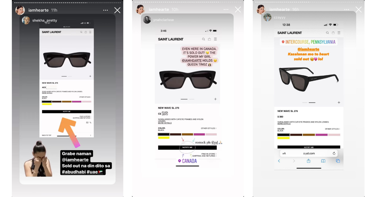 It didn’t take long for her Instagram followers to grab their own pairs, with some tagging her in their shade selfies. "Heart made me do it," Internet users captioned their IG stories. Priced at $380 (P19,000), the Saint Laurent Paris-engraved piece has been selling like hotcakes in both online and physical stores. It has even been sold out in some parts of the world like Dubai, Canada, Pennsylvania, Paris, and California.