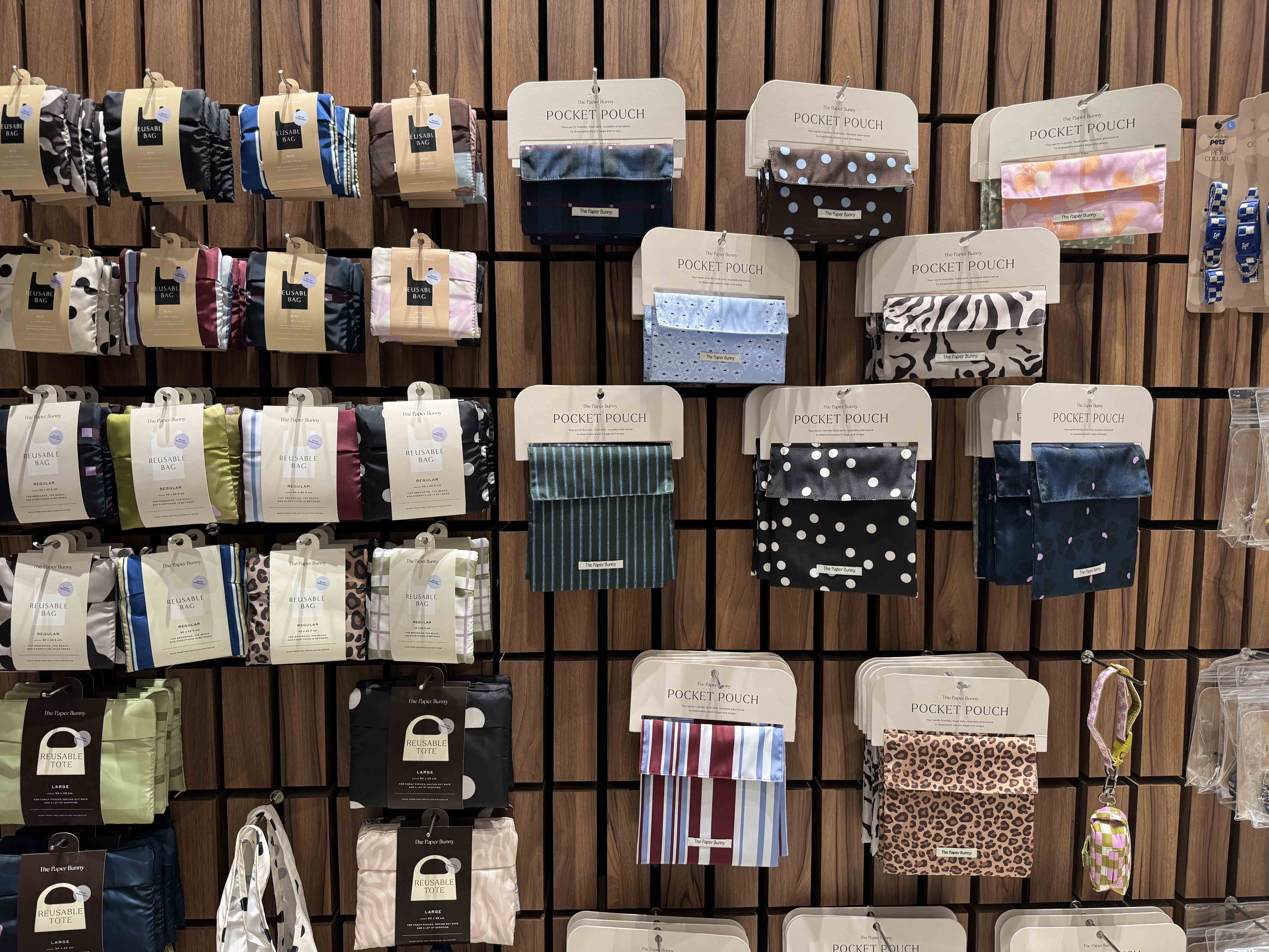 There are rows and rows of their iconic handbags, as well as walls of stationery, reusable bags, pocket pouches, and other accessories.