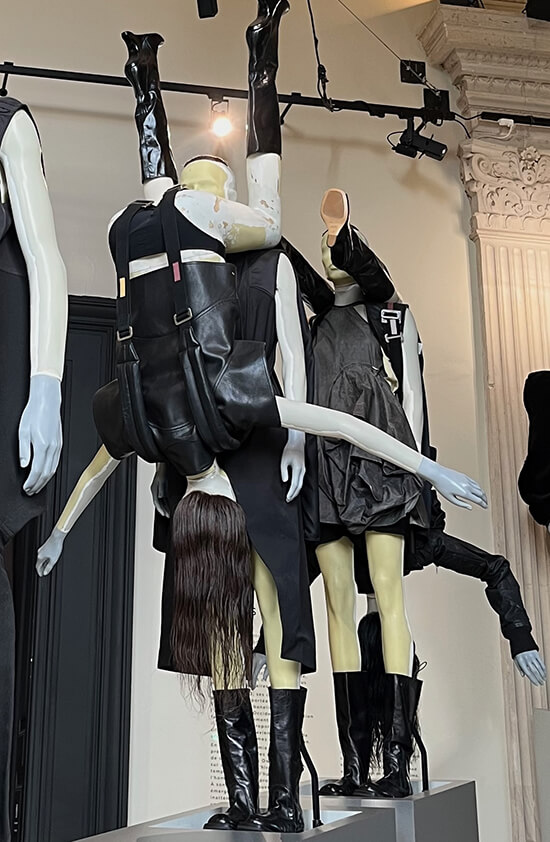 Entering the dimly lit main hall of the exhibit, you may think that he has been reformed. The installations are like altars with some elongated mannequins dressed like monks in robes, positioned like a choir by the tabernacle, with side chapels featuring gowns in muted shades, from old white to dust and dark shadow.