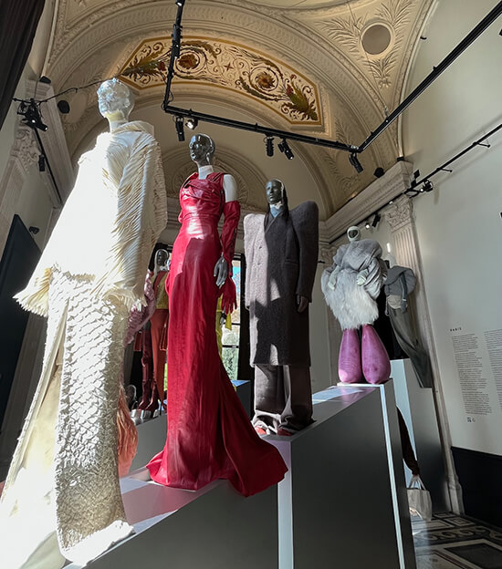 Here, his aggressive and sumptuous creations, often compared to Brutalist architecture, began to be presented in increasingly spectacular fashion shows, including one with male models in outfits that displayed their private parts—a statement on toxic masculinity and the objectification of bodies.