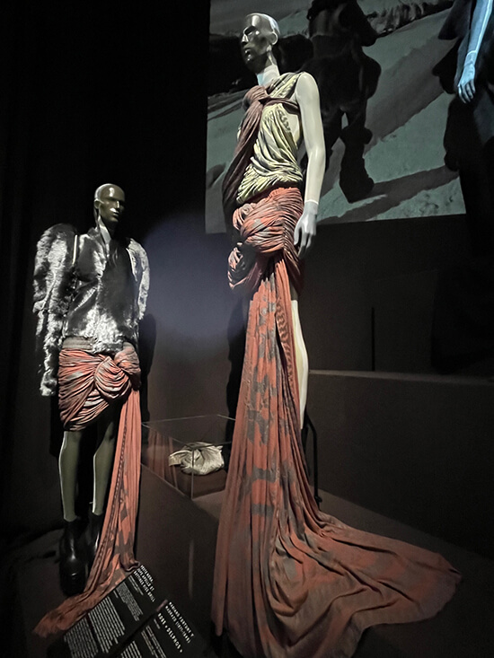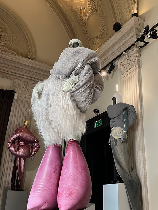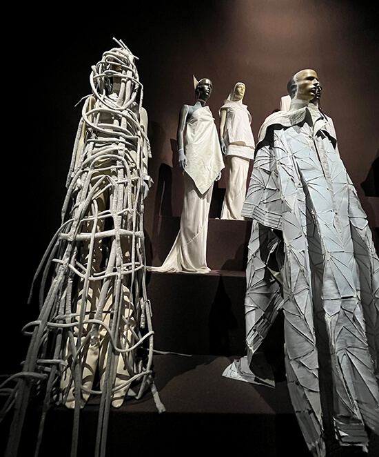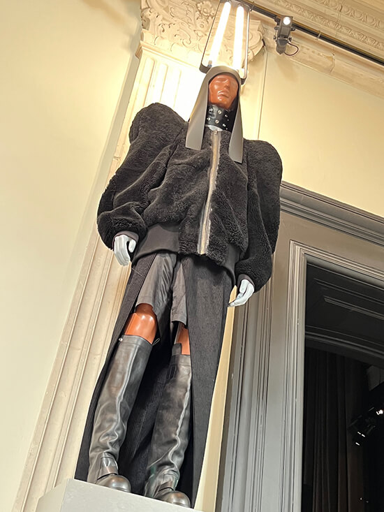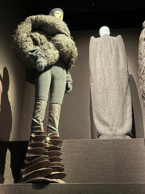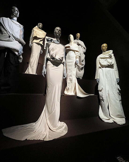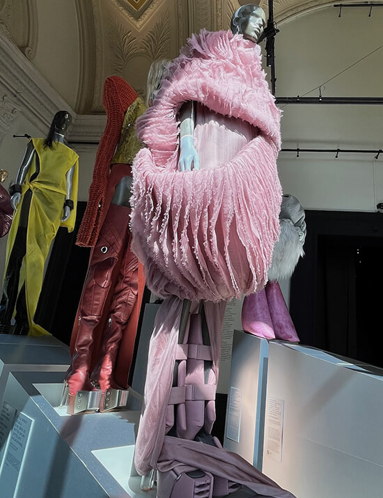 After recovering from the assault on the senses, we returned to the main hall of more subtle transgressions. There were actually gowns with pearls, but not of the grandma variety—they’re concealed under jersey, recalling what he read about the Yakuza and how they inserted pearls in their genitals. This collection was from the ’90s era when he was living under the threat of AIDS, and exploring body modification was a way for people to deal with fear and rage and reclaim ownership of their bodies.