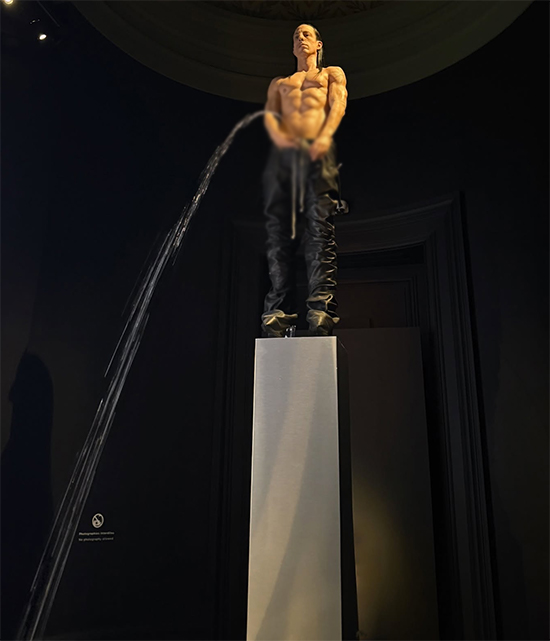 It was also in LA where Owens discovered the underground and sex club scene, a period that informs his work and is immortalized in “The Joy of Decadence” in the secret room of the exhibit. His naked wax figure—his version of Brussels’ “Manneken Pis”—greets you, acting as a centerpiece fountain with the water stream forming an arch through which videos of BDSM and other erotic practices either engage you or scare you away.