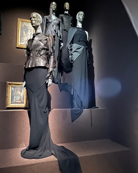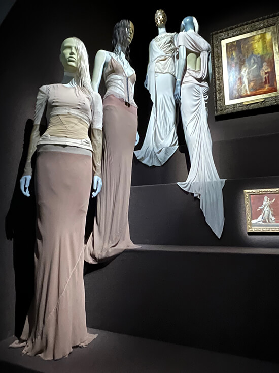 Another influence is Gustave Moreau, whose painting “Salome Dancing Before Herod” (1876) is described in Huysmans’ novel. Studies of the work are on display with gowns from 1997 and 2001, showing how their mystical aura and pictorial sophistication have a profound effect on the designer’s aesthetic.