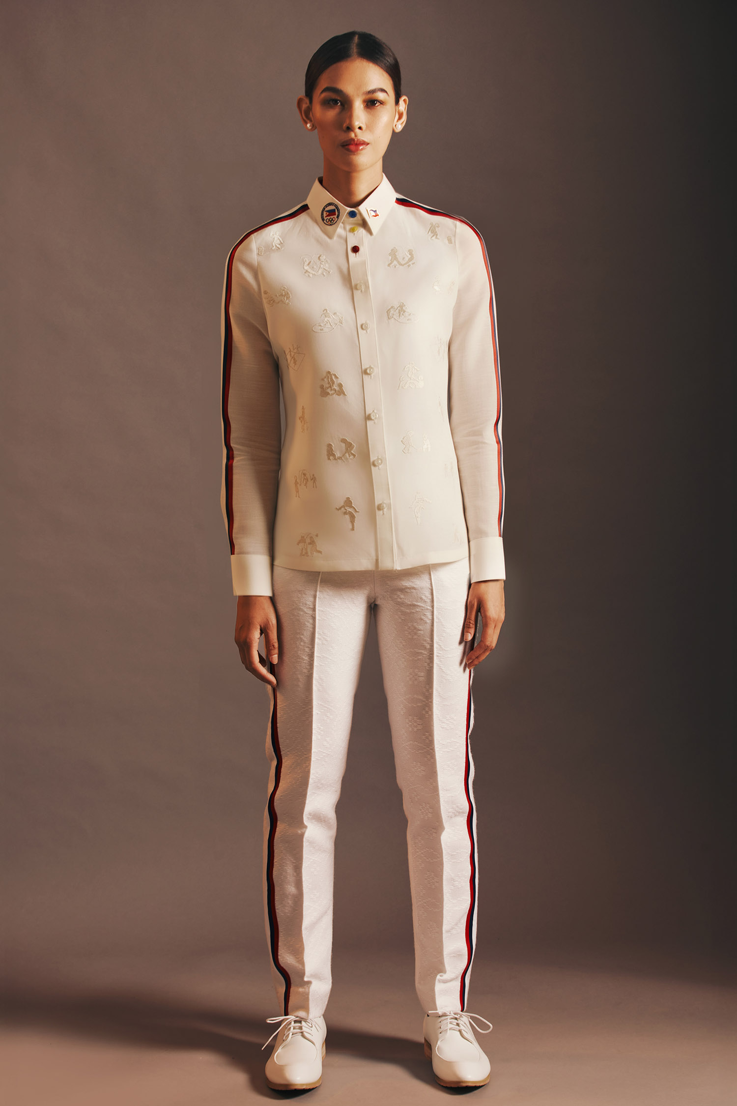 The top is hand-embroidered with images that represent different Filipino games such as piko, tumbang preso, trumpo, luksong baka, luksong tinik, patintero, yoyo, sipa, luksong kalabaw, luksong lubid, and syato.