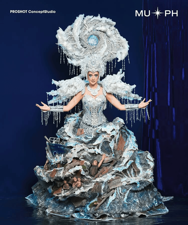 Among the standout candidates is Tacloban’s Jacqueline Gulrajani, who used the Super Typhoon Yolanda that wreaked havoc in the province as her costume. Her skirt featured elements of human-like figures wading through the waters, along with pieces of destroyed materials. Her shoulders were adorned with cloud-like armor, while her headdress featured a white and silver bedazzled figure of a cyclone with a center that resembles the eye of the storm.
