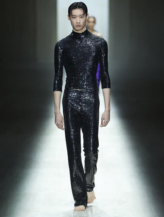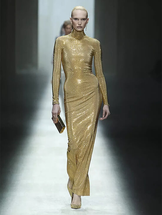 Demna did not replicate Tom Ford. He recalibrated that tension, filtering it through precision and product discipline. The show opened with a seamless white hosiery minidress, a deliberate palate cleanser. Tailoring softened into liquid fabrics. Jackets were cut low; trousers subtly adjusted posture. Invisible heat-sealed edges and engineered curved hems brought garments closer to the body.