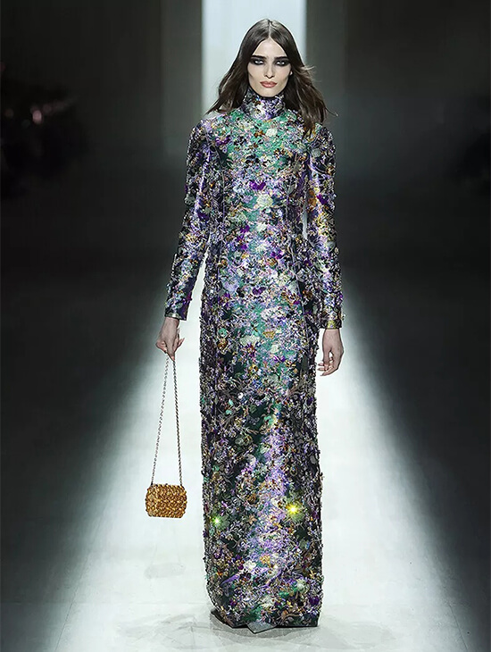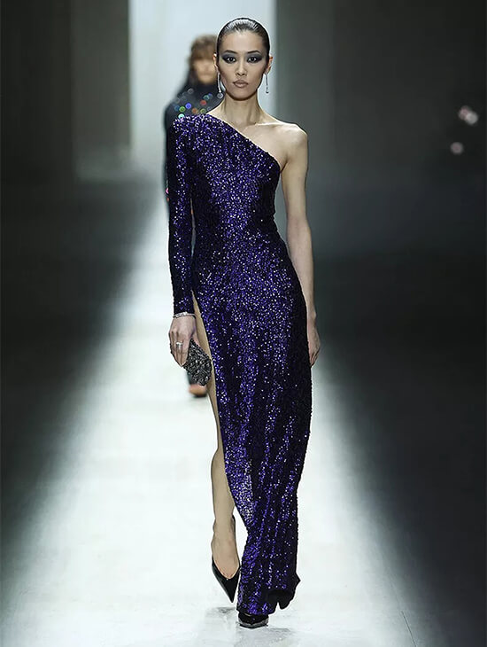 That influence surfaced in chiseled tailoring, Grecian draping, and body-aware silhouettes that felt sculpted rather than adorned.