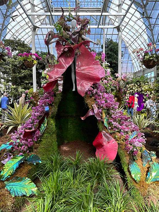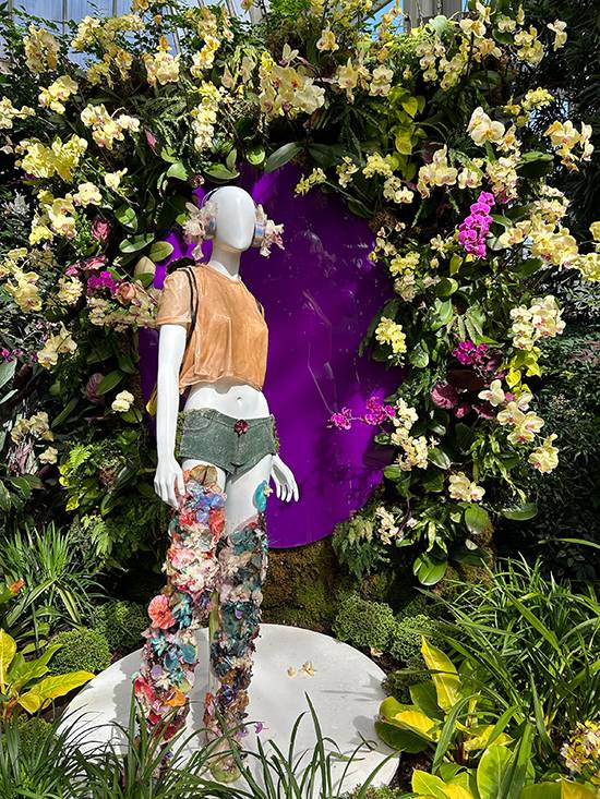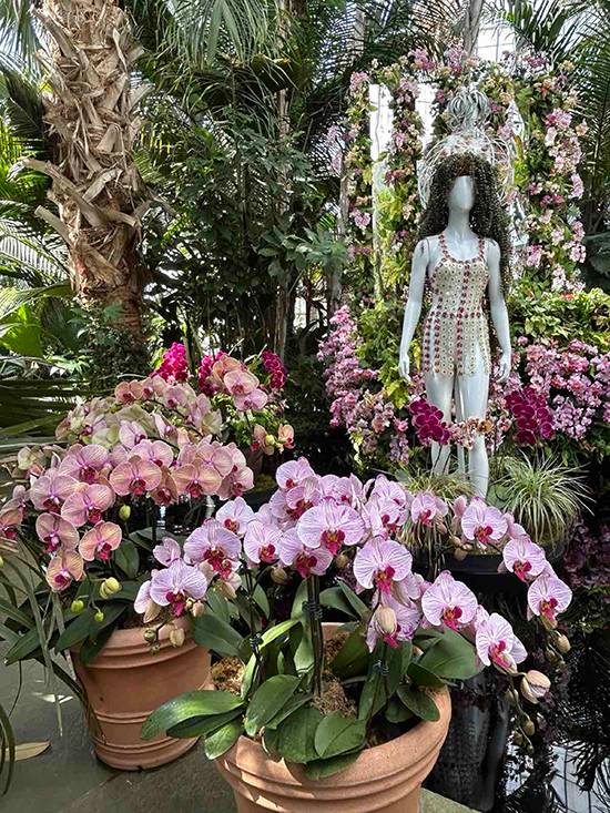 This year’s orchid show, “Florals in Fashion,” signaled the arrival of spring. It showcased dazzling petals, velvety blooms and glamorous bouquets transformed by designers into fabulous costumes one wouldn’t dare wear. Wrapped around mannequins or what seem to be human figures, the orchids appear so fragile, fragrantly inviting and refreshing to the spirit. I imagined how the artists and designers, with the supervision of the orchid curator, must have fastidiously worked to transform the flowers into installations.