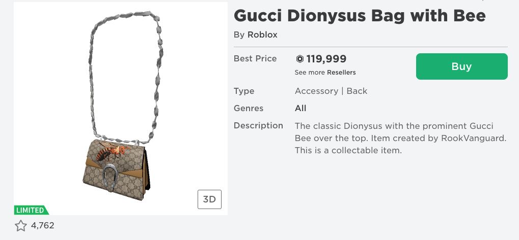 A Gucci bag in Roblox resold for 350,000 Robux or roughly $4,115. The same purse IRL costs $3,400.