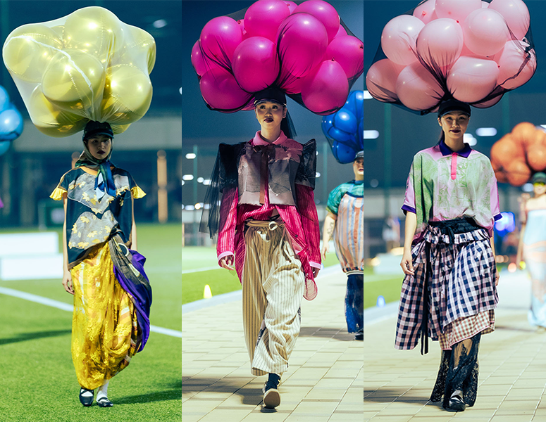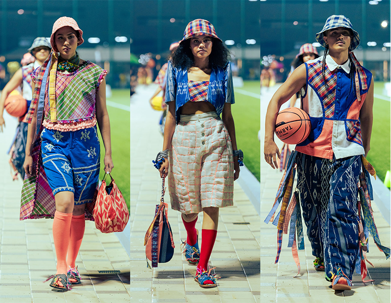 In “Basketball Parabola,” Len Cabili, founder of Filip+Inna, taps into the Philippines’ favorite sport, which she shared with her father, while infusing elements of our culture. The curved line trajectory of the ball’s movement is manifested in construction and patterns utilizing handwoven fabrics and craft techniques from indigenous communities. Patchwork barongs go sleeveless while multi-plaid diagonals mixed with tribal weaves update kimonas and cropped terno tops matched with stitched quilted bermudas and knee-high neon socks.
