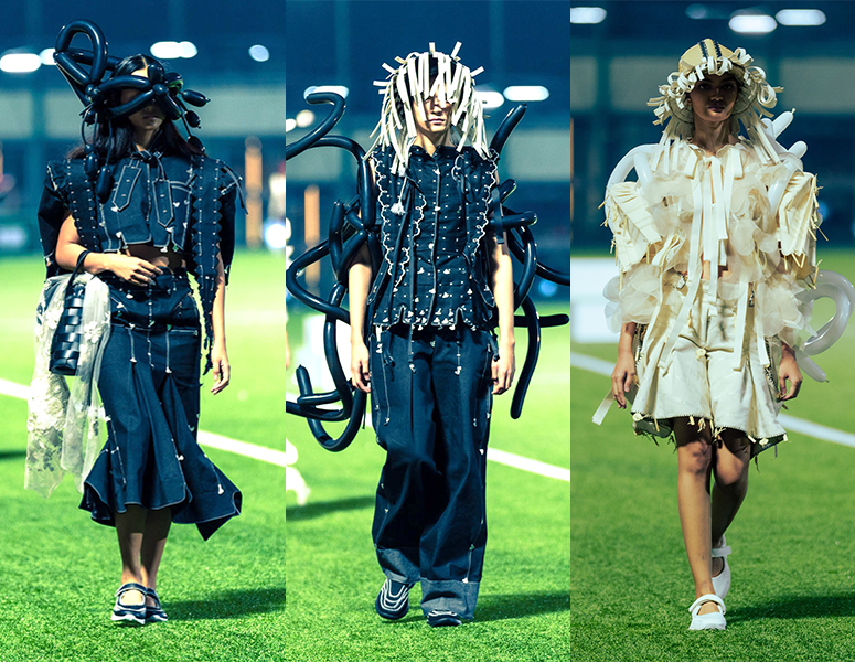Glyn Alley Magtibay, a finalist at Ternocon 2023 where her ternos with X-ray films were snapped up by celebrities, came up with a collection just as stunning—inspired by the energy of college muses and star athletes in “Intramurals,” fusing traditional Filipino textiles with sportswear fabrics: A mesh cropped kimona tops a denim skirt with a tapis of plaids and lace or goes neo-Baroque pannier with a chess-board pattern in yakan weave studded with actual chess pieces. Barongs have hand-stitched snaking patterns or are layered under numbered piña jerseys.