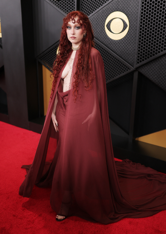 Chappell Roan was a standout with her custom sheer maroon Mugler gown. The romantic georgette négligée dress featured faux nipples and nipple rings. She also draped a maroon cape in one of her looks.