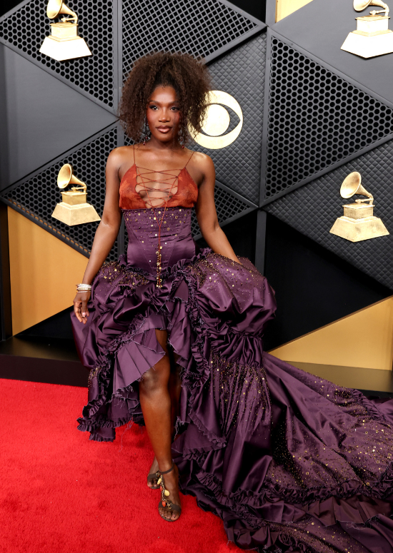 Anxiety hitmaker Doechii made sure to own her moment on the red carpet, wearing a Roberto Cavalli dress. The look featured a burnt-orange top, with a plum-colored corset that extended to a skirt with ruched details that had a 13-foot train.