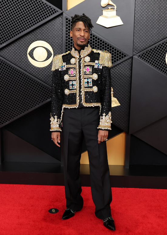 Jon Batiste graced the red carpet with her military-inspired gold and black bedazzled jacket, embellished with colorful gems on the back.