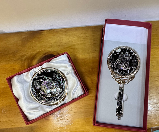 There is Princess Hwnayup’s Minago beauty balm in an elegant blue and white porcelain container with a matching guasha scraper. There is also rouge in a similar blue and white casing. The beautiful, intricate mother of pearl hand-held mirror and foldable hand mirror look very “royal.” There are scents too like the Changgyeonggung Palace Korea Cherry perfume inspired by the scent of Cherry Blossoms.