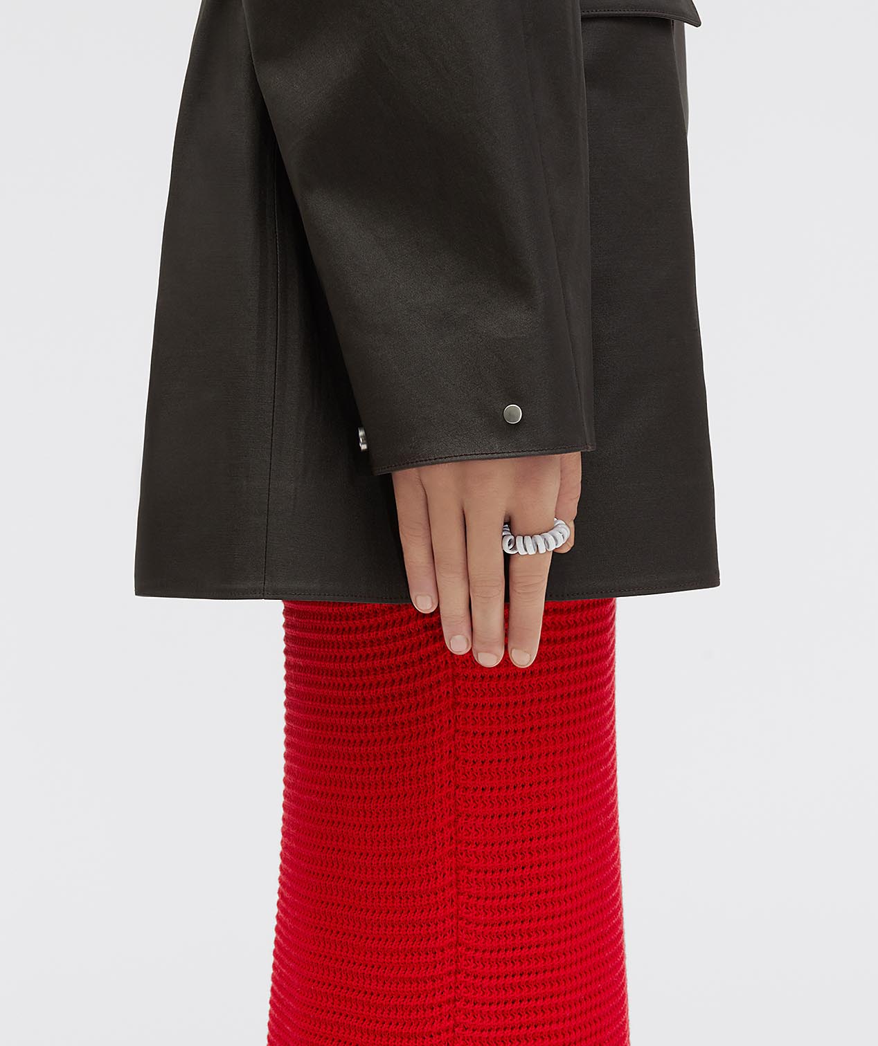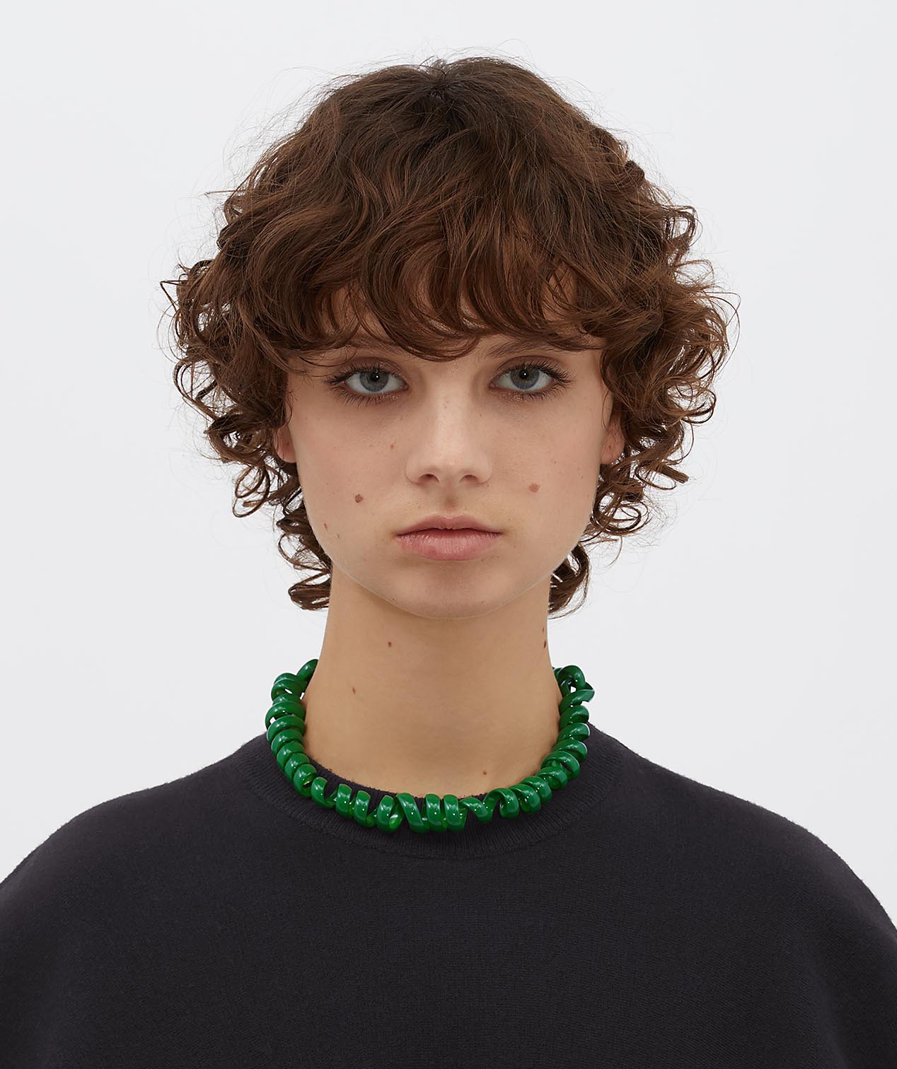 Those plastic, telephone cord–like elastics are making a comeback—but not as a hair accessory, but as jewelry.