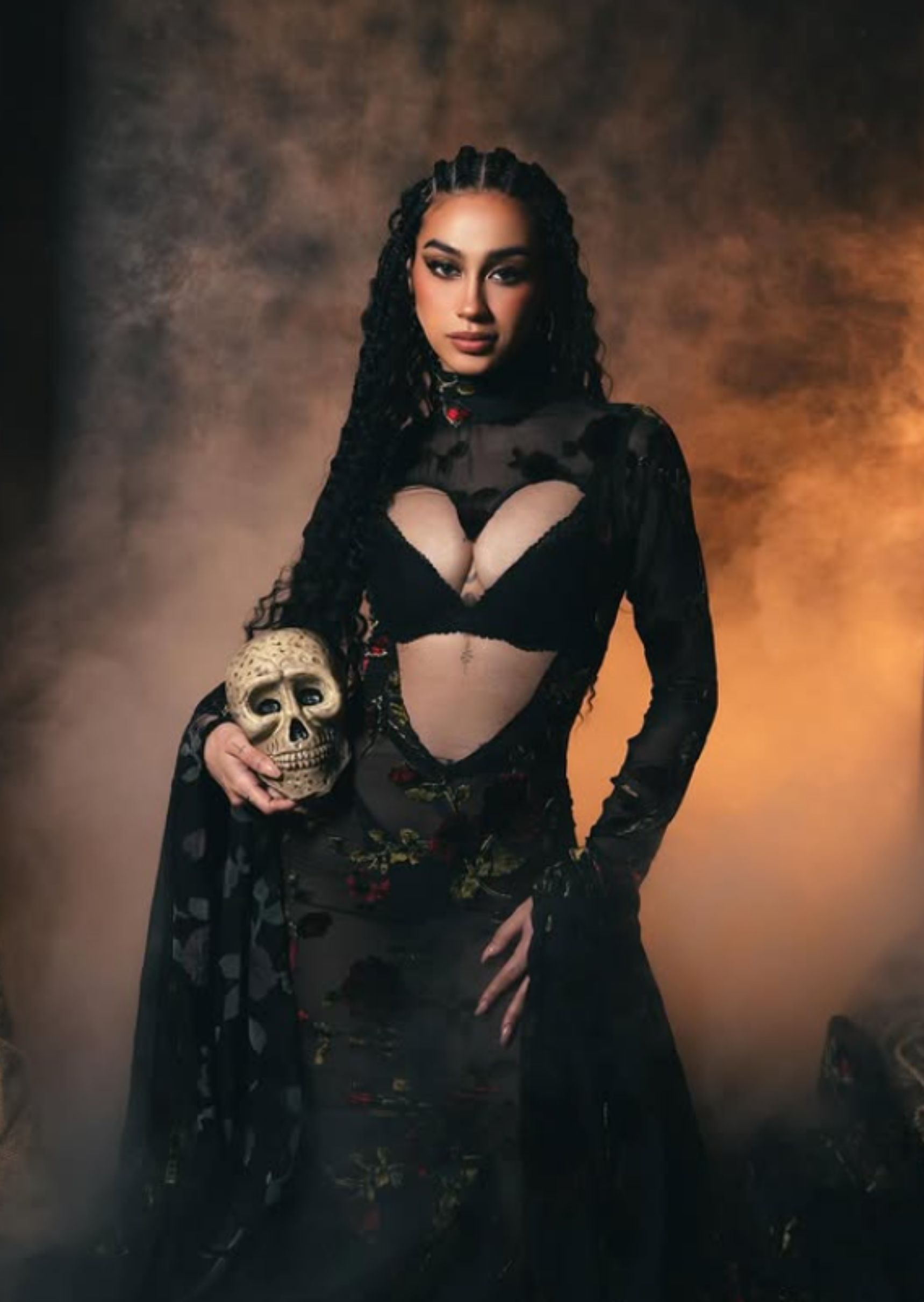 Zeinab Harake Parks is drop-dead gorgeous in a long, sheer black floral dress featuring a heart-shaped cutout that reveals a stunning silhouette. She holds a skull in one hand as her long, luscious curls cascade down her shoulders.