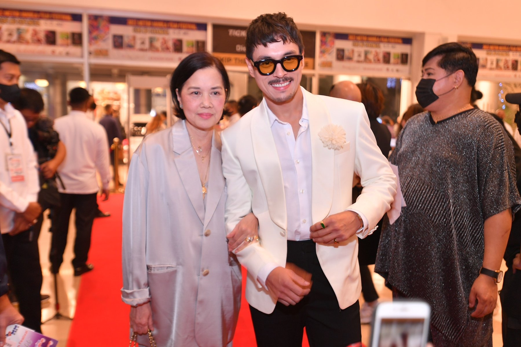 My Father Myself's lead star Jake Cuenca, meanwhile, arrived at the New Frontier Theater wearing a white coat. He arrived with his mom, Rachele Leveriza.