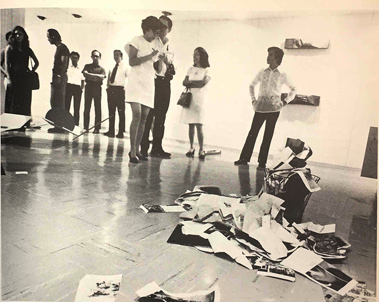 Enter Chabet, who decided to make his own statement on the book by making it the centerpiece of his newest work of art. That work had two parts: the first was a private performance piece during which he tore the book to shreds and then stood on his head in yoga poses on its crumpled pages. The second was a more public renunciation. He appeared at a prearranged time at the opening of a CCP exhibit, pulled the pages out of a paper bag, and stuffed them into a trashcan in the center of the Small Gallery. This would be Chabet’s indelible contribution to “An Exhibition of Objects” in January 1973, which is otherwise forgotten now. The spectacle caused a sensation.