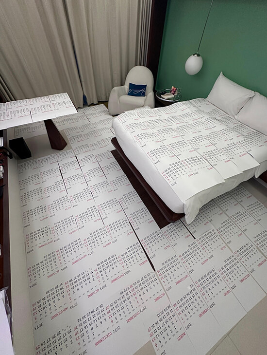 We should not be surprised, then, that the performance of stenciling calendars up to the year 2099 while seated outside the Ayala Museum would lead to something similarly provocative at Art Fair Philippines. When the fair opens privately on Feb. 5 and then to the public on Feb. 6, you may expect that Ampparito’s 75 years’ worth of calendars will be hard to miss. The artist is playing around with many ideas of how they can be displayed—in lines? Wrapped around the stairs? Covering an entire wall or just in groups at eye level, so the dates and years can be clearly seen?
