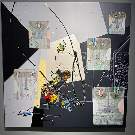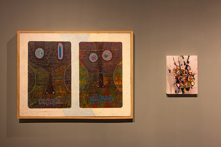 In each of the three, what look like reimagined Francis Bacon room spaces with architectural passages are overlaid with Lorenzana’s “heads” of various depth and size, like floating ghosts with gazes addressing the viewer intimately. Chun then took back the work (“I was surprised he consciously left me spaces to work over again”) and added bursts of action, color-loaded lines suggestive of Ralph Steadman or, indeed, Bacon’s glimpses of motion.