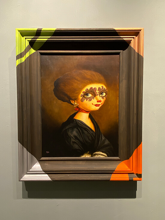 They come from very different backgrounds—Lorenzana is self-trained, a public administration graduate who worked in the Senate for a time before turning his perusal of the faces there in the gallery into vivid portraits that mix Filipino elements, pop surrealism, political satire and an Old Masters’ palette. This was a period where Luis was getting noticed for group shows in the US, featured in write-ups in The Washington Post, amongst others, when he was apt to decorate his portraits in pastoral or historical settings with cartoon-like faces: young misses with disarming gazes, decorated in punk makeup or with lollipops stuck in their mouths, or clutching a small creature called Bluefallo. Their classical wooden frames were also often decorated with “Aladdin Sane”-era Bowie makeup slashes.