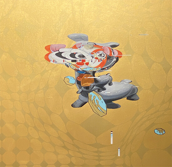Chun, meanwhile, studied painting at Yale University School of Art and did his master’s at the School of Visual Arts in New York. But he wanted something else, something closer to the idea of movement and shifting time that he associates with growing up around oceans (Tacloban, Hawaii). The back room of MONO8 features past works by both artists leading up to their collab, and one of Chun’s is a self-portrait: it shows a very abstract deconstruction of a dragon figure against gold Chinese patterns, bisected by floating cigarettes, slicing their way through the central figure. There’s a horizontal movement here, as though planes are shifting on the canvas, in a linear path through space and time. “It’s very much like the movement of seeing the waves,” notes Bautista.