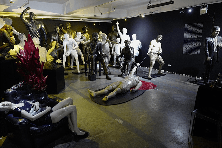 As host to the images, Lluch used molds from a previous work titled Irresistible Grace (mounted at Art Fair PH in 2020), to create human forms in cold-cast marble. That exhibit shows a reinterpretation of Juan Luna’s Spoliarium through larger-than-life figures of Filipino people and protests against the violence of the recent war on drugs. For this show, the bodies of the characters in the tableau are cut up and cast as dismembered body parts. It continues the theme of violence. Lluch commented, “For me, it is a symbol of a country in distress. A country that is oppressed and subjugated by a foreign or more powerful force.”