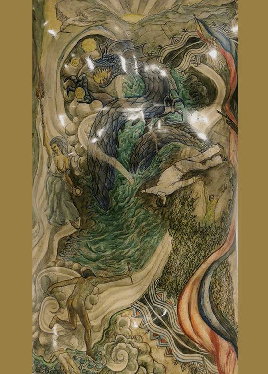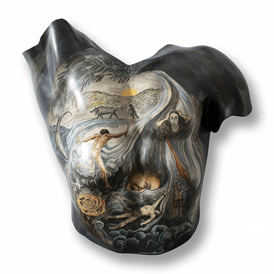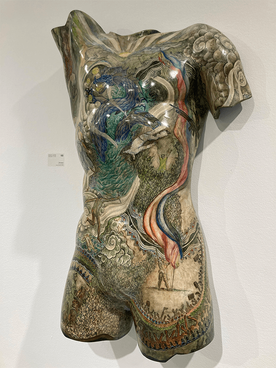 The piece that initiated the series is titled Resistance 1521 and was occasioned by the Quincentennial celebration of the circumnavigation of the world and one of the first documented defenses against invaders in Mactan island. The piece is a limbless torso with one hand seemingly outstretched. On its skin are indigenous warriors fighting off metal-clad invaders in a swirling landscape of land, seas, and skies.