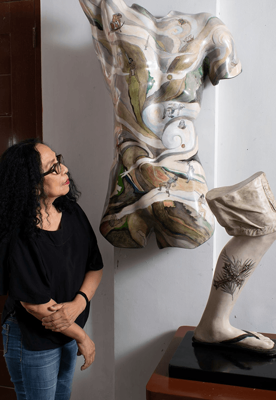 Another piece titled EDSA Chronicles uses the same molded figure painted over with a montage of scenes during the twilight of Ferdinand Marcos’ martial law: the assassination of Ninoy Aquino, Cory Aquino addressing a sea of people in yellow. On the center of the torso is a winding Bakunawa, a serpent-like mythical creature about to devour the moon. Folklore recounts how people thwarted the Bakunawa’s attack by shouting “Luli kanamo ang among Bulan!” (Give us back our moon!). Lluch acknowledges that she is not a historian, but her selection of symbols digs up our history of dissent, which is enough to show that Filipinos are, and have always been, empowered people.
